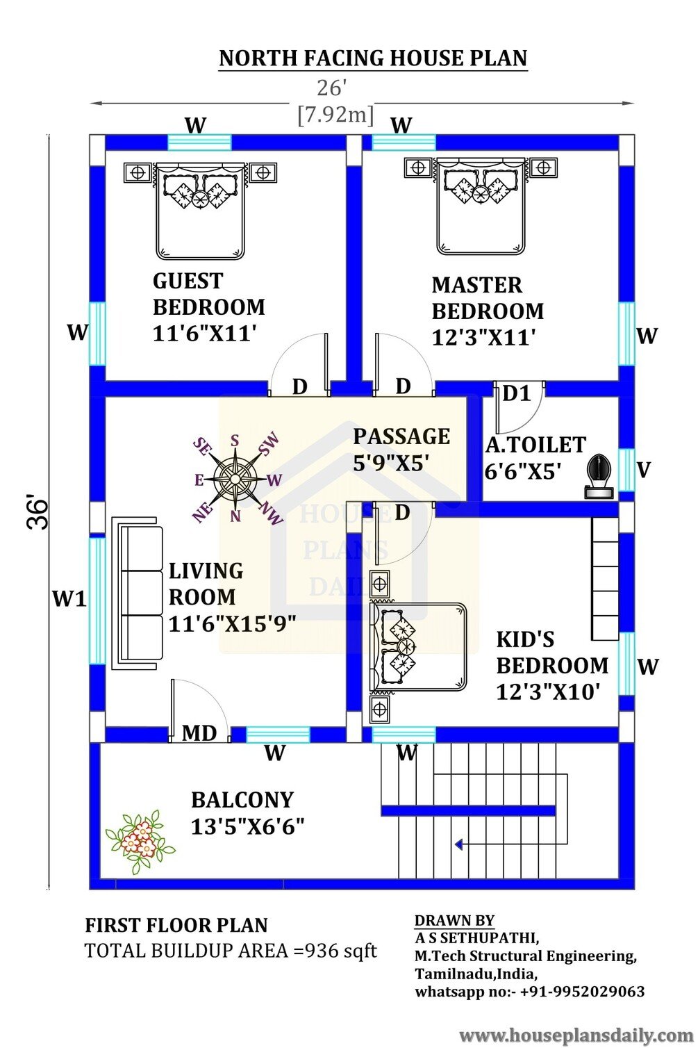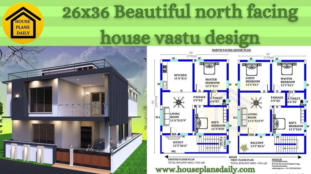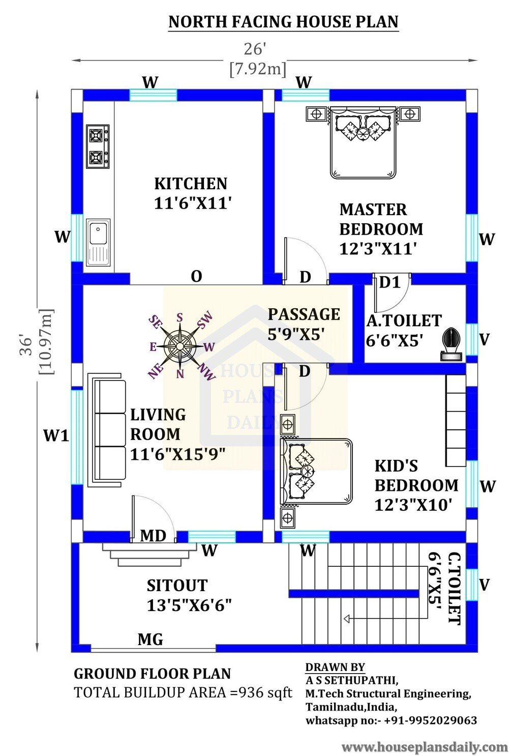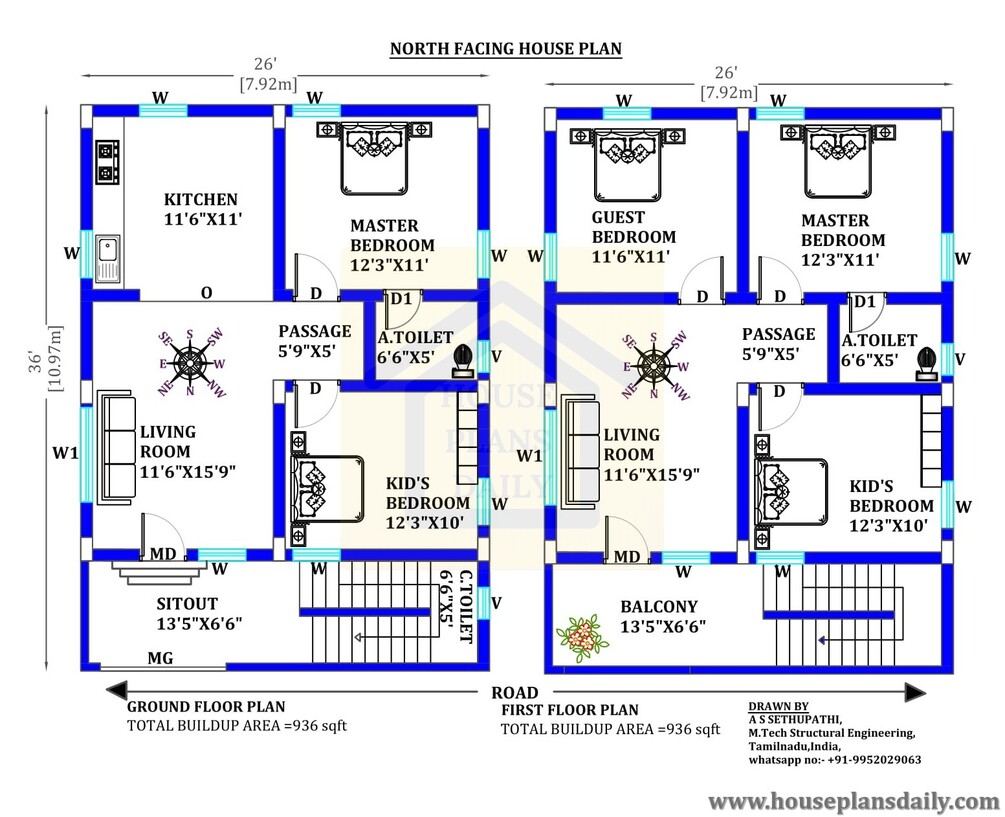 26x36 north facing house vastu design is given in this article. The total area of the ground floor and first floors are 936 sq ft and 936 sq ft respectively. This is G+ 1 house building. The length and breadth of the house plan are 26’ and 36’ respectively. This is a 5bhk north facing house plan. The staircase is provided outside of a home.