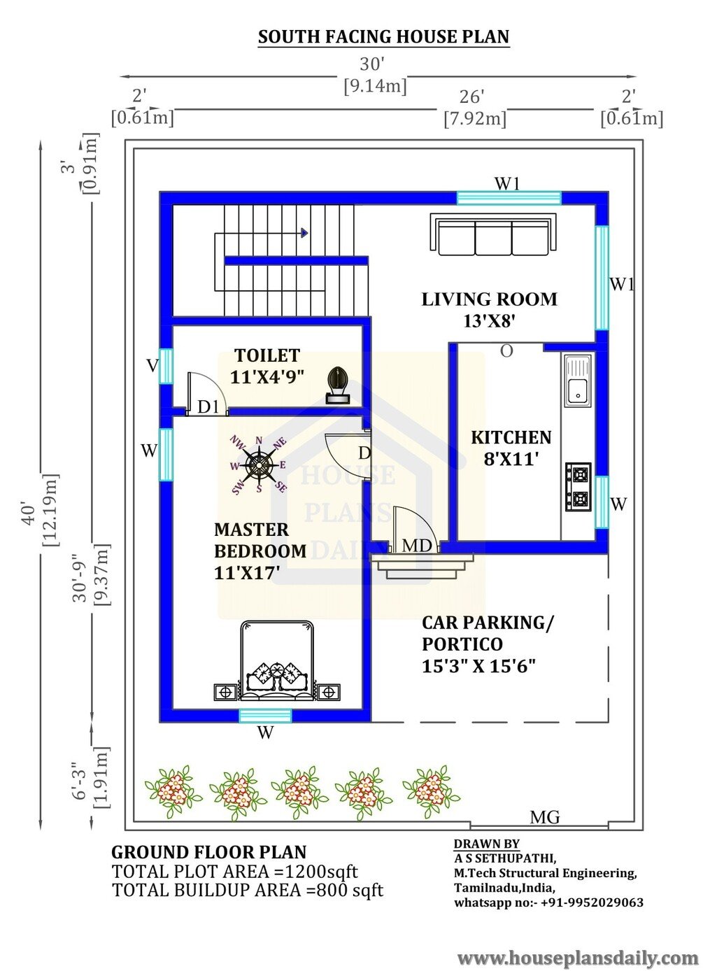 30x40 south vastu plan is given in this article. The total area of the ground floor and first floors are 1200 sq ft and 1200 sq ft respectively. The length and breadth of the house plan are 30’ and 40’ respectively. The total built up area of the ground floor and first floors is 800 sq ft and 800 sq ft respectively. This is a 3bhk south facing house plan with car parking. The staircase is provided inside of a home.