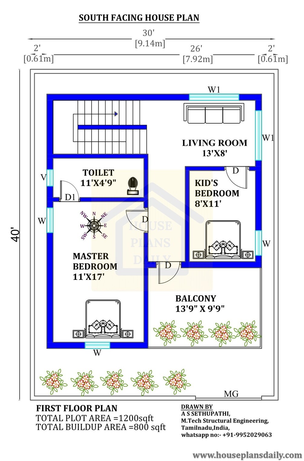 30x40 south vastu plan is given in this article.  The total area of the ground floor and first floors are 1200 sq ft and 1200 sq ft respectively.  The length and breadth of the house plan are 30’ and 40’ respectively.  The total built up area of the ground floor and first floors is 800 sq ft and 800 sq ft respectively.  This is a 3bhk south facing house plan with car parking.  The staircase is provided inside of a home.